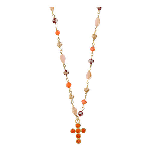 Golden cross pendant necklace with orange zircon 925 silver. A 925 silver gold-plated necklace, adorned with a cross embellished with orange zircons and enriched with faceted stones of various orange tones, varying in size from 0.3 to 0.5 cm, distributed along the circumference. Measuring 46 cm in length, the cross necklace features an adjustable closure, ensuring a comfortable and versatile fit. Part of the collections of the Italian brand Agios, combining harmoniously faith and fashion, offeri...