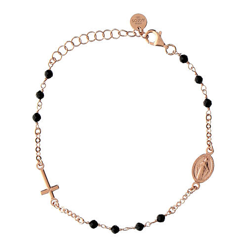 Miraculous bracelet rose black beads Agios.Classic religious bracelet in 925 silver with a rose finish, with black faceted stone beads. The bracelet features a cross-shaped charm and a Miraculous medal.