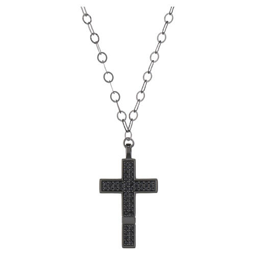 Modern cross pendant necklace set with a pavé of black zirconia, mounted on a forzatina curb chain with riveted links. The 925 sterling silver is finished with ruthenium, giving a refined dark metallic tone and providing resistance to tarnishing and corrosion. Length 41 cm, extendable to 44 cm via extension chain and lobster (lobster‑claw) clasp. Benedictus, your devotion in a jewel. It is part of the Icon collection. It is delivered with a presentation box, warranty certificate and matching shopper bag. Weight: 5.2 g.