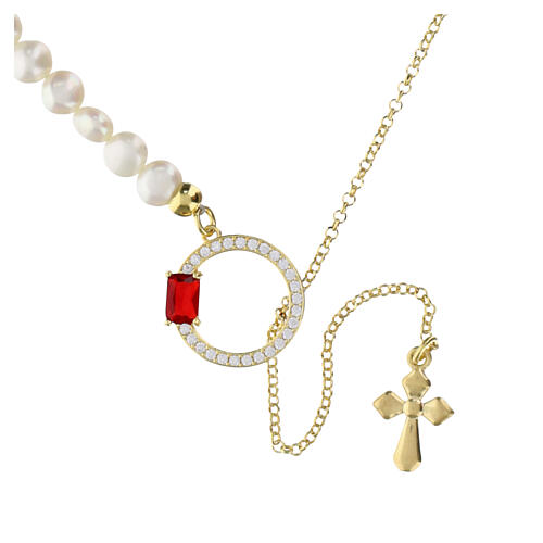 Benedictus gold-plated 925 sterling silver necklace with a cross pendant, featuring a strand of natural irregular-shaped pearls and a central circle set with pave zirconia and a 5 mm rectangular ruby-red zircon. Adjustable via a lobster clasp: 40 cm length, extendable to 43 cm. Benedictus, your devotion in a jewel. It is delivered with a certificate, gift box and matching shopper bag. 100% Made in Italy. Part of the Icon Collection. Weight: 12.8 g.