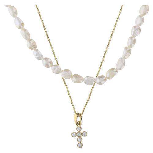 Double Necklace with Natural Pearls and White Zircon Cross Gold-Plated Sterling Silver, Benedictus