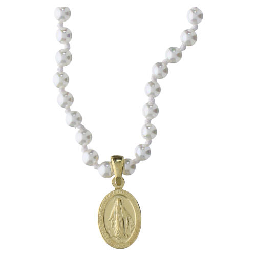 Miraculous Medal Necklace, gold-plated 925 silver with mother-of-pearl beads - Benedictus. Catholic necklace with a Miraculous Medal pendant in 925 silver with gold plating, measuring 15 x 10 mm. The chain is composed of 4 mm round mother-of-pearl-colored beads strung on cord. Adjustable via a lobster clasp: circumference 42 cm, extendable to 45 cm. The jewel is supplied with a certificate, gift box and matching shopper bag. 100% Made in Italy. Ideal as a meaningful gift. Part of the Icona collection. Weight: 9.7g.