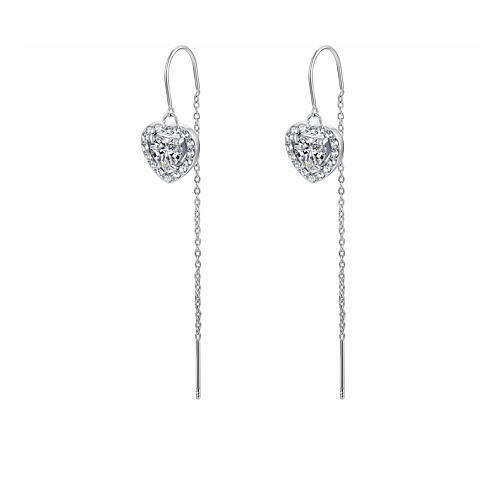 Stainless steel sliding drop earrings featuring a white heart-shaped zircon framed by a luminous row of small white zircons that enhance its brilliance. The pendant has a rigid U-shaped body that transitions into a dangling chain, adding movement and elegance to the design. Versatile and refined, they can be worn in a single piercing with the heart at the lobe and the chain trailing down the ear, or slipped through multiple piercings to create a striking spiral effect. The jewelry weighs 3.3 g, with a heart diameter of 1 cm and a total length of 7 cm.