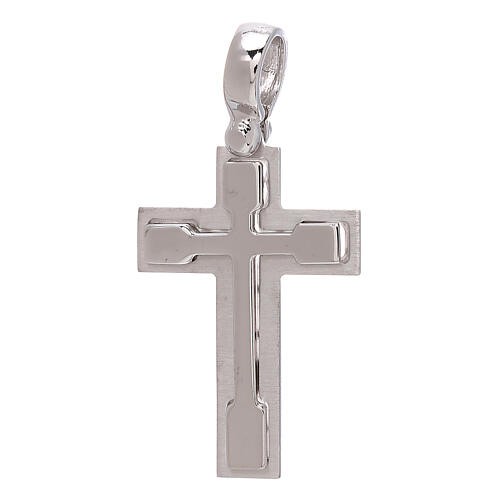 Cross pendant 18-carat white gold with polished insert 3.2 gr. Cross in 18-carat white gold with polished base finished in rhodium and insert in polished white gold with square ends. Pendant handcrafted by an italian jewellery with hallmarked ring.