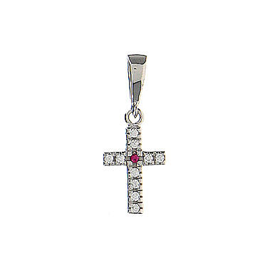 Cross pendant strass white red white gold 18 kt 0.8 gr.This religious cross pendant is made up of a cast base in rhodium-plated white gold with 18-karat Degussa rhodium, 11 white strass zircons and a ruby-colored center set by hand.This necklace cross pendant is the work of specialized Italian artisans and comes with a certificate of guarantee, shopper bag and box.