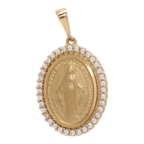 Miraculous Medal pendant 18-carat gold white crystals 3.4 gr. Pendant made of 18-carat yellow gold and palladium alloy with a central oval medal minted and diamond polished and an external microcast outline inlaid with 36 white crystals by hand.The medal represents Our Lady of Miraculous Medal on one side and Mary's monogram on the other one.Pendant made in Italy by a well-experienced company. Accompanied by guarantee certificate in a jewelry box.Jewel weight: 3.4 grammes.