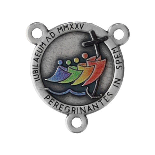 Silver rosary centerpiece with a 1.7 cm diameter medal. One side features the Jubilee 2025 logo with the motto ''Pilgrims of Hope'', while the other side depicts the Madonna with Baby Jesus in her arms, surrounded by the inscription ''Totus Tuus Mater Ecclesiae''.