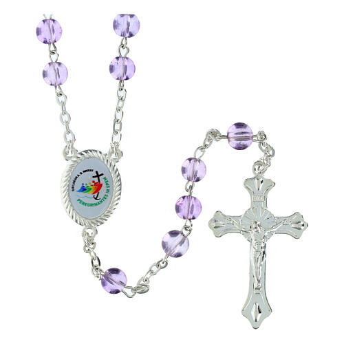 6x4 cm Box Jubilee Purple Glass Rosary. Simple plastic box, size 6.8 x 4.7 cm and 2 cm thick, with a colored Jubilee 2025 logo printed on the lid. Inside, a rosary with purple glass beads is held. Total length of the rosary is 48 cm with a circumference of 64 cm. Beads measure 0.6 cm, while the centerpiece, 2.2 x 1.5 cm, displays the Jubilee logo on one side and the inscription ''Pray for Us'' on the other. The Catholic rosary beads are finished by a cross measuring 4 x 2.5 cm.