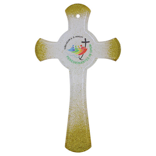 Wall cross with white glass circle featuring gold glitter and Jubilee 2025 logo, measuring 21x12 cm. The white glass cross with a golden glitter finish highlights the contours, bringing brightness to the composition. The official Jubilee 2025 logo is centered within the circle, making it a symbolic representation of the celebration. A modern design combined with the use of traditional materials results in a decorative and devotional piece. Crafted in Italy using selected materials, it is hand-finished to ensure quality, durability, and attention to detail. Packaged in a shock-resistant box, it is perfect as a religious gift or commemorative item for sacred spaces.