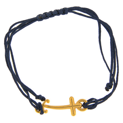 Endless golden anchor cross bracelet with adjustable blue thread. Blue thread Catholic bracelet embellished with a golden cross that ends up as an anchor symbol of the Jubilee and hope, the cross is 2.4 cm high and 0.7 cm wide. The Jubilee 2025 bracelet has a circumference ranging from 14 to 24 cm and is adjustable.Accessory made in Italy by expert craftsmen. This beautiful religious bracelet belongs to the Endless brand by Teresa Roma.