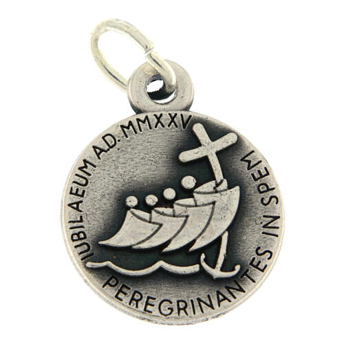 Jubilee 2025 official logo medal with Mater Ecclesiae 13 mm. This round metal Catholic medal is finely crafted on both sides. The official logo of the Jubilee 2025 is engraved on the front, accompanied by its motto in Latin. On the back appears the silhouette of Mater Ecclesiae. With a total height of 2.5cm, including hook, this medal can easily be transformed into a necklace or used as a pendant on a bracelet. This medal is a reminder of the 2025 Jubilee but also a symbol of faith to always carry with you.