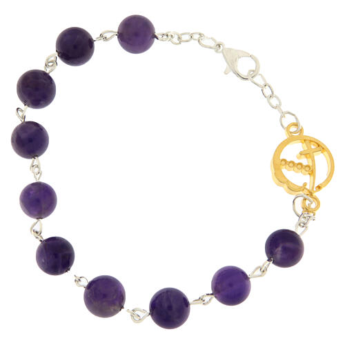Jubilee bracelet golden medal steel with amethyst beads, Endless. Steel bracelet with ten amethyst beads, characterized by different shades. The Catholic bracelet has a circumference of 22 cm and is equipped with a practical clasp. It is enriched by a perforated golden charm with a diameter of 1.4 cm, decorated with the official Jubilee logo. Made with care by Italian artisans. This bracelet belongs to the Endless brand by Teresa Roma.
