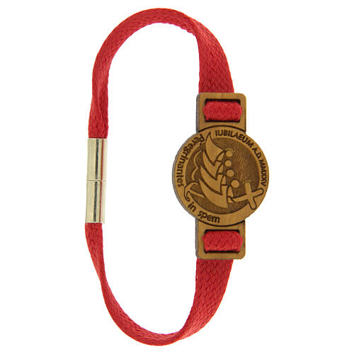 Jubilee bracelet with red band, Clarisse Monastery Albano Laziale. This Jubilee 2025 handcrafted bracelet, made entirely in Italy, is a unique accessory that combines design, spiritual meaning and quality Italian craftsmanship. Consisting of a red rope cord with a diameter of 16 cm and magnetic closure, it offers a comfortable and practical fit.The pendant, with a diameter of 3.8 cm, is made of fine Italian olive wood and decorated with an accurate engraving of the official logo of the Jubilee 2...