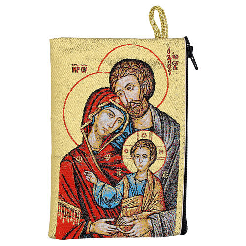 Jubilee Holy Family Rosary case 10x15 cm. Fabric rosary case measuring 10x14.5 cm, decorated with the official logo of the Jubilee 2025 on a gold background on one side and an image of the Holy Family on a gold background on the other. Equipped with a practical zipper and fabric hook, it is a functional and symbolic accessory for storing your rosary beads.