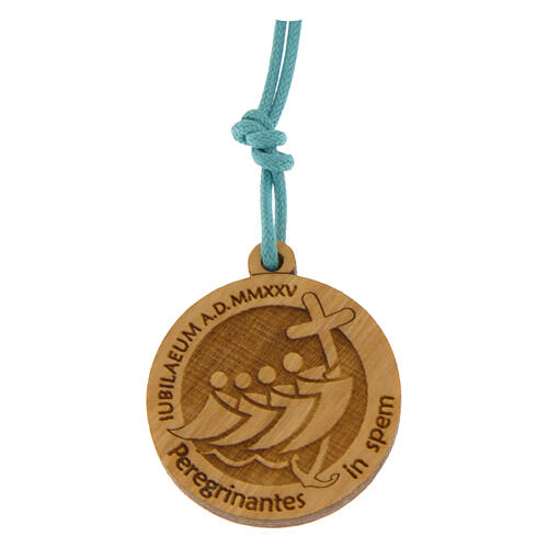 Jubilee necklace celestial cord olive wood pendant Poor Clare Monastery Albano Laziale. This handcrafted Catholic necklace, made entirely in Italy, is made up of a 77 cm long light blue rope strand with an adjustable closure. Versatile and practical, it can be folded on itself, transforming into an elegant bracelet, perfect for any occasion. The Jubilee 2025 pendant, with a diameter of 2.7 cm, is made of fine olive wood and features an accurate engraving of the official logo of the 2025 Jubilee, accompanied by the Latin motto ''Peregrinantes in spem'', a universal message of faith and hope. Included in the package is a card with the Jubilee motto translated into different languages, as well as detailed information on the origin and craftsmanship of the product. This jewel was created with care and dedication by the Poor Clare Sisters of the Monastery of the Immaculate Conception of Albano Laziale, renowned for their craftsmanship and the quality of their creations. A unique and meaningful accessory, which celebrates the excellence of Made in Italy, the values of the Jubilee and the craftsmanship of the Poor Clare Sisters.Perfect as a keepsake or special gift.