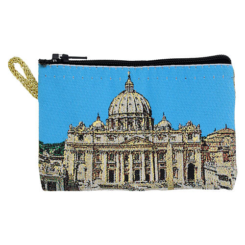 Fabric rosary pouch measuring 7.5x11 cm, adorned with the official logo of the 2025 Jubilee on a golden background on one side, and an image of St. Peter's Basilica on the other.