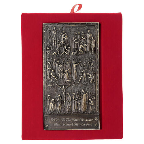 Modern Holy Door Basilica S Paolo in alloy 17x9 cm in velvet box. Modern Holy Door of the Basilica of San Paolo Fuori le Mura, in zinc and copper alloy with golden finish, dimensions 17x9 cm, presented in a velvet box measuring 23x19x3 cm. The modern Holy Door, created in 1967 by the sculptor Enrico Manfrini, is decorated with symbols of mercy and reconciliation. Open only during the Holy Years, it represents a spiritual invitation for pilgrims seeking renewal.This reproduction, handcrafted in Italy, reflects the quality and tradition of an Italian foundry. Each piece combines skill, passion and respect for the environment, conferring uniqueness and spiritual value.