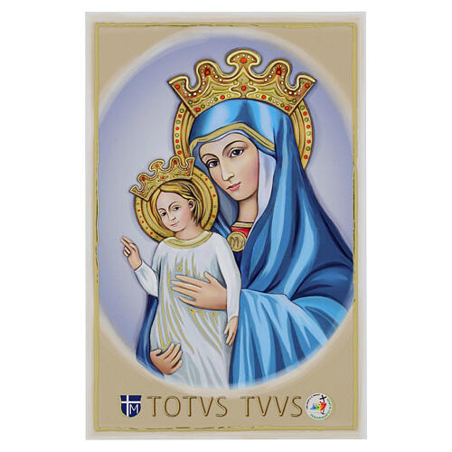 Our Lady Totus Tuus Picture Jubilee 2025 Logo, 18x10cm Valenti. This Catholic wall picture was created by the Italian company Valenti Argenti, paying tribute to the Madonna of the Totus Tuus, a symbol of the Marian consecration so dear to St. John Paul II. The high-definition print enhances the sweetness of the image, characterized by serene yet intense colors that give depth and harmony to the composition. Mary is depicted with a delicate blue mantle, while the Baby Jesus wears a white robe, em...