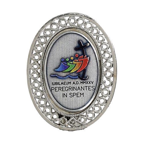Oval metal Jubilee 2025 picture, measuring 4.5x3.5 cm, adorned with elegant swirls on the sides. At the center, the colored logo of Jubilee 2025 is displayed, accompanied by the official motto engraved at the bottom. A symbolic and sophisticated item to commemorate this Holy Year 2025 special event.