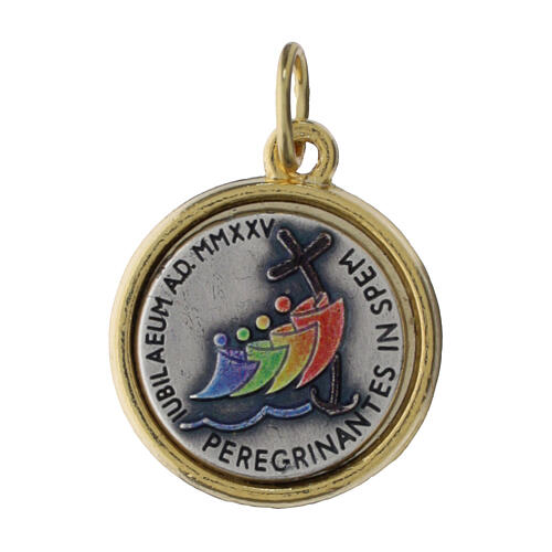 Zamak pendant with Jubilee 2025 logo and St. Peter's Basilica 2 cm. Silver-colored zinc pendant with golden outer detail. The 1.6 diameter medal features the Jubilee logo with the motto 'Peregrinantes in Spem' on one side and depicts a representation of St. Peter's Square on the other.