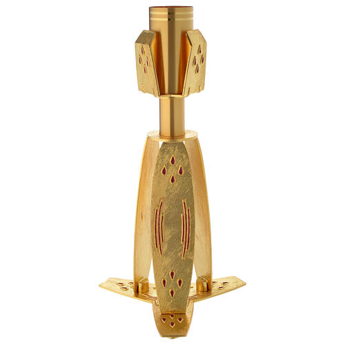 Candle stand in silver plated bronze with red enamel decorations. The candle holder and the base are finely decorated with red enamel. With the same style you can find candle holders, candle stands, wall crucifixes and lamps. Candle stand manufactured by an Italian company with high experience in the field of church furnishings.