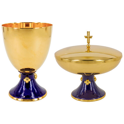 Chalice and ciborium in golden metal, enhanced by a red fire enameled base adorned with four golden crosses, symbols of faith and sacredness. The altar chalice measures 17 cm in height with a cup circumference of 11 cm. The pyx, on the other hand, stands at 11 cm with a circumference of 17 cm. Both sacred vessels are artisanally crafted in Italy, showcasing exquisite workmanship including turning, fire enameling, hand finishing, and 24-carat gold electroplating. A prestigious liturgical set that blends symbolism and beauty in every detail, perfect for enhancing Eucharistic celebrations.