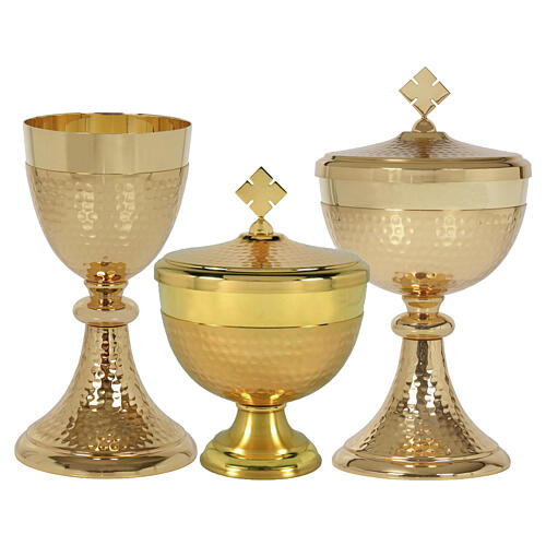 Chalice and ciborium in gold-plated hammered brass with smooth knot
