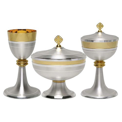 Chalice and ciborium in silver-plated brass with a sober, modern line. Chalice, covered ciborium and low ciborium are Made in Italy and feature a matte silver-plated brass finish, while the knot is smooth and polished in gold-toned brass, creating an elegant contrast. The upper rim of the chalice and both ciboria is trimmed with a polished golden-brass band that adds brightness and continuity to the design. The covered ciborium is completed by a simple, well-defined stylized golden cross; the low ciborium reproduces the same workmanship and style as the main piece, ensuring uniformity across the set. A harmonious and versatile ensemble, suitable for any altar and for every Eucharistic celebration. Dimensions: Chalice 20.5 cm height, 9 cm cup diameter. Ciborium 23 cm height, 12 cm cup diameter. Low Ciborium 15.5 cm height, 14 cm cup diameter. Care instructions: wipe with a soft, dry cloth; do not use abrasive products that may damage the surface.