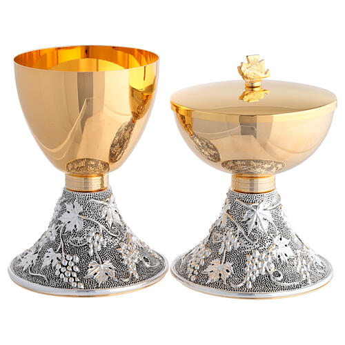 Refined liturgical sacred vessel set featuring chalice and ciborium with guaranteed 24K gold plating. They are characterized by smooth glass and knot, while the base is adorned with dots and relief images of grape clusters and leaves. The chalice stands at 16.1 cm in height with a cup circumference of 11 cm, while the ciborium, crowned by a cross and a fish, rises to 16.5 cm with a circumference of 11.5 cm. Crafted in Italy, ensuring artisanal quality. Each set includes a cleaning cloth and a fabric bag for careful storage of the chalice and ciborium.