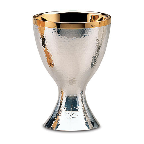 Chalice and paten Molina with shiny finish in 925 solid sterling silver. The chalice is entirely hammered by hand by the artisans of Molina and is finished in shiny silver.