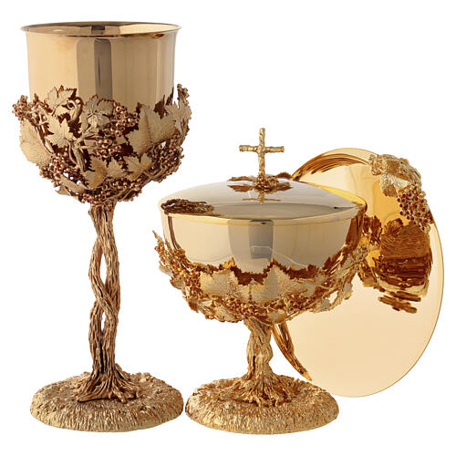 Chalice, Ciborium and Paten Grape Bunch Model with Crystals, 18K Gold Plated, Pical Arte