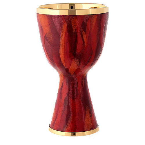 Catholic chalice in golden brass and enamel, characterized by simple and soft lines. The exterior is completely glazed in shades of red with lighter and darker strokes that form a dynamic ray image that runs throughout the cup. 18.5 cm tall and 11.5 cm in diameter.This chalice is an elegant handcrafted work, subjected during the creation process to a long series of steps including; turning, manual processing, fire enameling and the 24-carat gol...