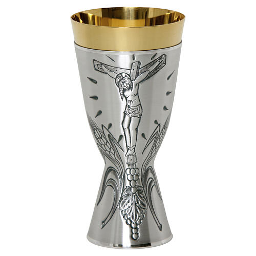 This chalice is crafted in silver-plated brass and entirely hand-chased, featuring a depiction dedicated to the Passion of Christ. With modern lines, it represents the Body of Christ on the Cross, surrounded by ears of wheat and clusters of grapes, quintessential Eucharistic symbols.