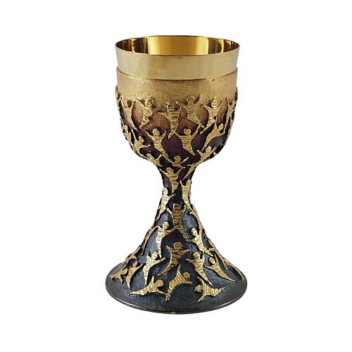 Church chalice with double silver and 24kt gold finish, featuring a captivating design of stylized golden figurines ascending along the chalice body, creating a powerful symbolic effect. The surface displays an elegant chromatic gradient, starting with darker tones at the base and gradually lightening towards the top, culminating in the brightness of gold. Height: 22.5 cm, cup diameter: 10 cm. Crafted in Italy, this artisanal product is meticulously made through a process including lost-wax casting, turning, manual work, finishing, and galvanic plating. A contemporary and symbolically rich chalice that merges sacred art with Italian craftsmanship.