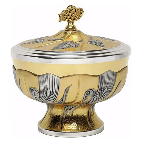 Catholic ciborium with wheat decoration and two-tone engraved lid. This church ciborium is made in Italy from two-tone brass with chased repoussé work. The cup is decorated with raised wheat motifs in silvered brass, creating a visual contrast with the main finish. The lid has a coordinated relief decoration of leaves and bunches of grapes and is topped by a fish in gilded brass. Designed for regular liturgical use, it is suitable for various celebratory contexts. Maintenance: use a soft, dry cl...