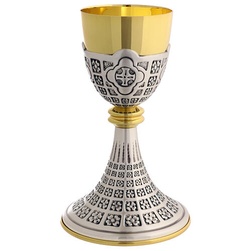 The hammered base is adorned with engravings depicting crosses and flowers enclosed in squares, a motif that harmoniously repeats at the base of the chalice. Standing at 22.5 cm tall, with a cup diameter of 9 cm and a base circumference of 13.5 cm, this church chalice embodies a perfect balance between symbolic value and Italian craftsmanship, ideal for mass celebrations.