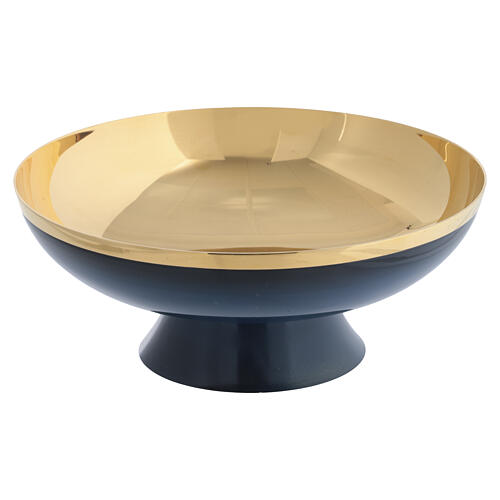 Catholic paten Produced by the Spanish company Molina, renowned for creating high-quality liturgical items. It is part of the prestigious Artimetal collection that combines craftsmanship and refined design. This offertory paten is made of internally gilded brass and externally coated with elegant blue enamel enhancing its unique and sophisticated style. Perfect for use in any liturgical celebration. Height: 6 cm, diameter: 16 cm.