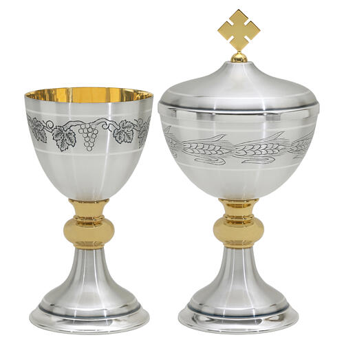 Two-tone chalice and ciborium with engraved wheat and grape decoration