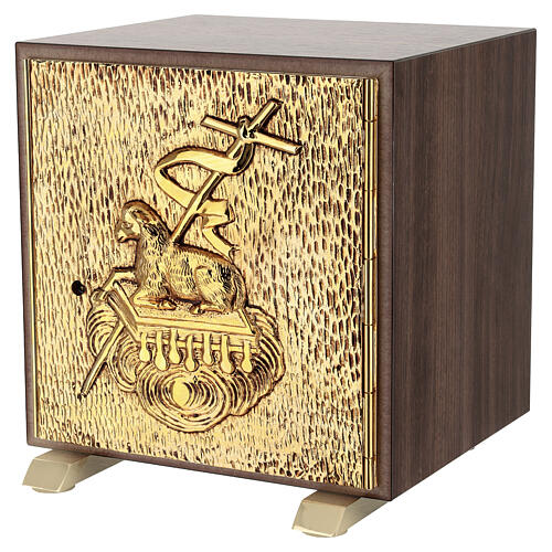 Church altar tabernacle Immolated Lamb in Trentino oak. Altar tabernacle made in Italy with 0.8 inches honeycomb wood structure, externally veneered in Trentino oak with natural grain. The armored door is cast in relief in gold plated brass and depicts the symbol of the Immolated Lamb with a central decoration on a worked background. The interior is lined with 1 mm gold plated brass sheet, with silver soldering and a 24-karat gold finish on all exposed metal surfaces. At the base there are gold-finished balancing feet, prepared for stable fixing via four concealed holes, accessible by removing the felt pads. Outside measures: 10.2 inches height, 11 inches width, 9.06 inches depth. Inside measures: 8.86 inches height, 8.86 inches width, 7.09 inches depth. Door measures: 8.67x8.67 inches.