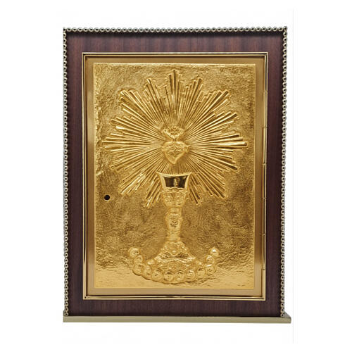 Altar tabernacle with spherical frontal frame, chalice and Sacred Heart, mahogany wood, 45 x 35 x 35 cm. This Catholic tabernacle is crafted from mahogany wood with gilded brass details and is produced by an Italian company specialized in sacred vessels. The workmanship is carried out by artisans experienced in wood and metalwork. The base is in gilded brass and a spherical gilded brass frame adorns the front edges, visually echoing the central door. Equipped with internal illumination, the door is decorated with a chalice from which rays emanate and with the Sacred Heart at the center. The decorations are produced by electroforming, a technique that ensures well-defined details. Designed for use on the altar, it fits easily into various liturgical settings. Internal dimensions are 36 x 26 cm. Cleaning recommendations: for brass parts use a soft, dry cloth or a cloth slightly dampened with warm water and dry immediately. For wooden parts use a dry or just damp cloth, avoiding standing water; do not use aggressive detergents, abrasive products or rough sponges to preserve the materials and finishes over time.