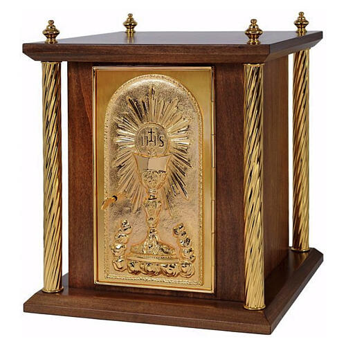 Mahogany wood tabernacle with chalice and IHS host decoration and gilded brass columns, 50x40x40 cm