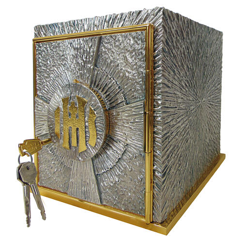 Silvered bronze Catholic tabernacle with gilded IHS-lettered borders, 50x40x40 cm. This table tabernacle is crafted from silvered bronze with a gold-colored base and is produced by an Italian firm specializing in liturgical furnishings. The workmanship follows traditional methods, with attention to the object's liturgical functionality. The door is defined by a gilded brass frame that highlights the central decoration: the letters IHS, from which rays radiate to form a cross. The letters open, a...