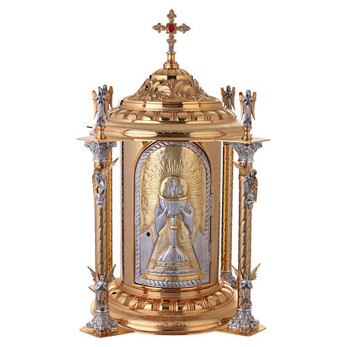 Gold-plated brass Catholic tabernacle with 4 angels, JHS and chalice. This finely crafted church tabernacle is cast in brass and finished with a rich, mirror-like gold plating. The architectural, canopy-like structure is supported by four twisted columns decorated with silvered elements and sculpted angels in relief at the base and apex. The circular base is richly worked with ornamental motifs. The central element is the tabernacle door, which features a magnificent Eucharistic relief: a chalic...
