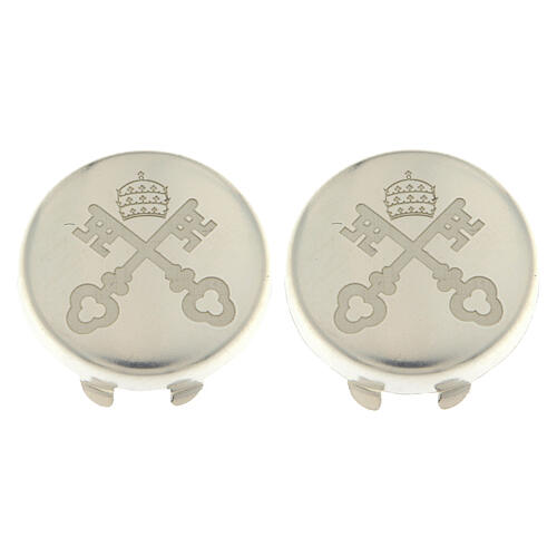 925 Silver Button Cover with Holy See Coat of Arms Engraving. Pair of 925 silver Catholic button covers embellished with a refined engraving of the Holy See's coat of arms, symbolizing spiritual authority and universality of the Church. Handcrafted in Italy, they combine manufacturing excellence with profound religious significance. Nickel-free and elegantly packaged, they have a diameter of 1.5 cm. Discreet yet symbolically rich details, perfect for subtly enhancing ceremonial attire, liturgical vestments, or official uniforms.