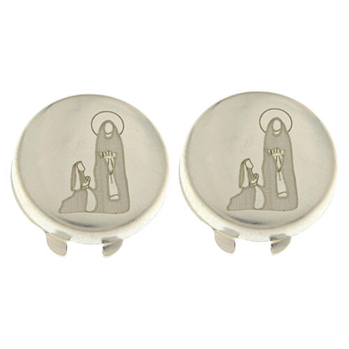 925 Silver Button Cover with Our Lady of Lourdes engraving. Pair of 925 silver button covers, elegantly engraved with Our Lady of Lourdes and a young woman in prayer at her feet. Crafted in Italy, they combine meticulous detail and deep spiritual significance. Nickel-free and presented in an elegant package, they have a diameter of 1.5 cm. Discreet accessories rich in symbolism, perfect for enhancing ceremonial attire, liturgical vestments, or official uniforms with a touch of faith and devotion.