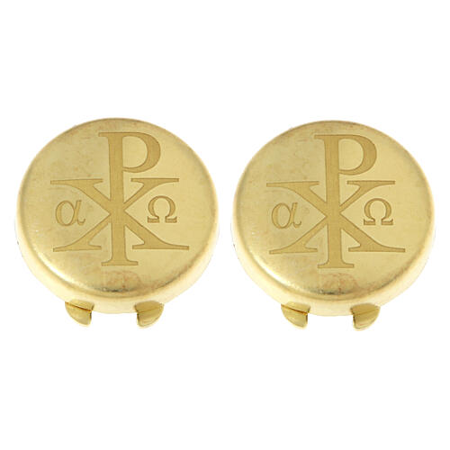 Golden PAX Alpha and Omega 925 Silver Button Covers. Pair of finely engraved golden button covers in 925 silver, featuring the PAX symbol accompanied by Alpha and Omega. Handcrafted in Italy, they perfectly balance symbolic value and high-quality craftsmanship. Nickel-free and elegantly packaged with a discreet diameter of 1.5 cm. Subtle yet meaningful details, ideal for subtly and uniquely completing ceremonial, liturgical, or official uniform attire.