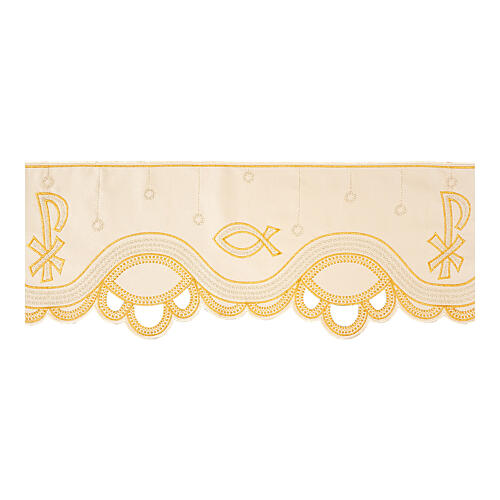 Ivory altar tablecloth trim fish h 20 cm. This altar tablecloth edge trim is perfect for decorating your altar cloth during celebrations. It is handcrafted by a Polish tailor in polyester satin.The trim is decorated with fish and abstract motifs, embroidered in gold. It measures 20cm high and is available in three different lengths: 3.5m, 7m and 14m.
