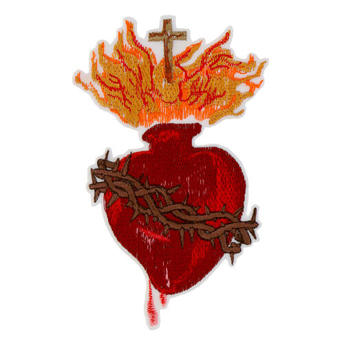 Sacred Heart Jesus iron-on patch 14x8.5 cm.High quality iron-on religious patch depicting the Sacred Heart of Jesus wrapped in a crown of thorns with a wound caused by a spear and dominated by a cross and flames. Measures 14x8.5cm. Made in Italy. Instructions: Position the heart patch in the point you prefer with the thermo-adhesive part in contact with the fabric, making sure that the garment on which you will apply it has no folds or wrinkles. Then cover the patch with a cotton cloth or clear ironing cloth and press firmly with the iron for about 30-60 seconds. Repeat the operation on the reverse for about 30-60 seconds. If the religious patch still does not adhere well to the fabric, do not raise the temperature of the iron but increase the application time, in order to avoid damaging the fabric. Wait a few minutes before wearing the garment. We advise you not to wash the garment within 48 hours of applying the patch. Additionally, for patches of this size it is recommended to secure the edges with a few stitches.