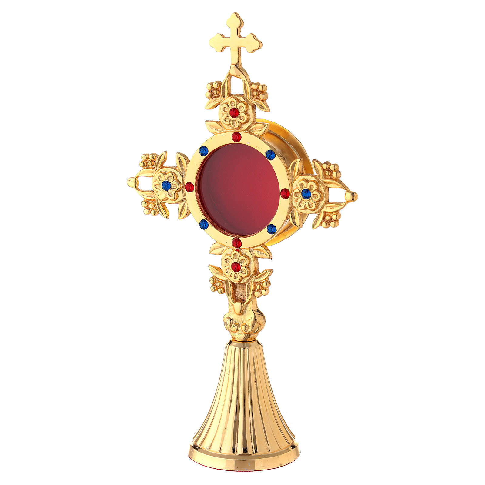 Gold plated brass reliquary with crystals and leaf fruit pattern 9.8 inches. Reliquary with high channeled base, circular viewing window lined in red velvet and decorated frame with white crystals. On the four sides the decorations become flowers, leaves and fruits with a budded cross on the top.