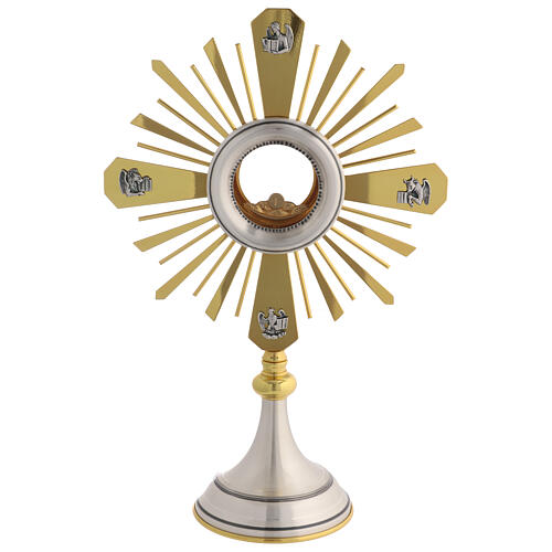 Gold and Silver Apostles Radiant Monstrance 46 cm. Made of gilded brass with a silver base, the result of the artisanal mastery of a small Italian company with over a century of experience in metalworking and sacred vessels. Each piece is 100% handmade, using exclusively Italian materials and enriched with artistic details that make it unique. The node and the radiant, both gilded, feature a dynamic structure with rays of different sizes. Four thicker rays are decorated with small silver metal figures representing the symbols of the Evangelists: the angel, the ox, the eagle, and the lion. The lunette has a circumference of 7.5 cm. It is designed to accommodate a 6 cm host and has an internal bowl-shaped lunette containing loaves to ensure perfect host stability. The monstrance stands at 46.5 cm in height and 30.5 cm in width, while the solid and harmonious base has a circumference of 15 cm. The design, quality of materials, and artisanal workmanship give this artifact unparalleled value.